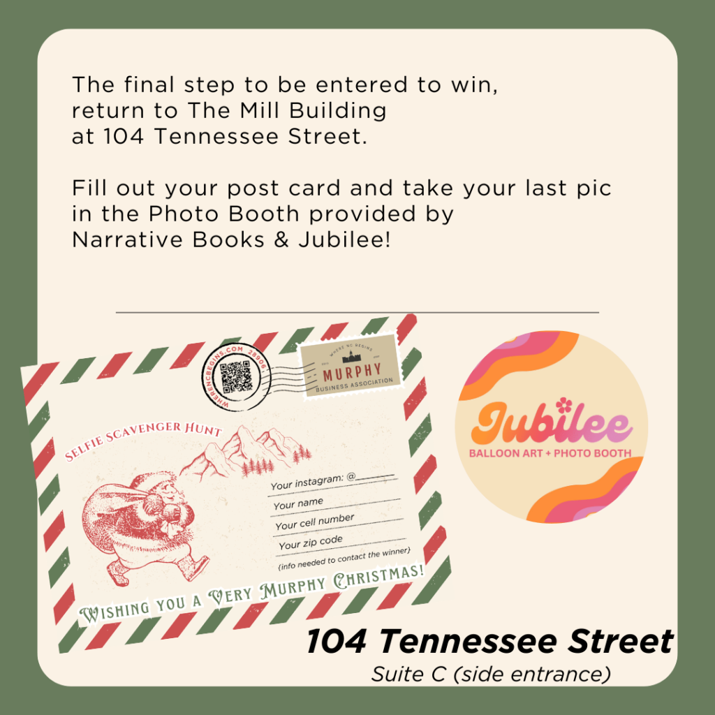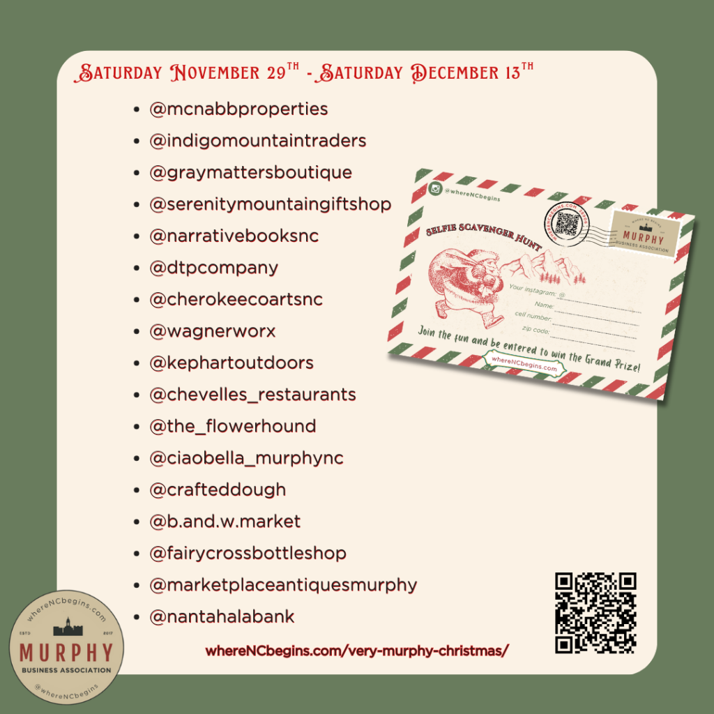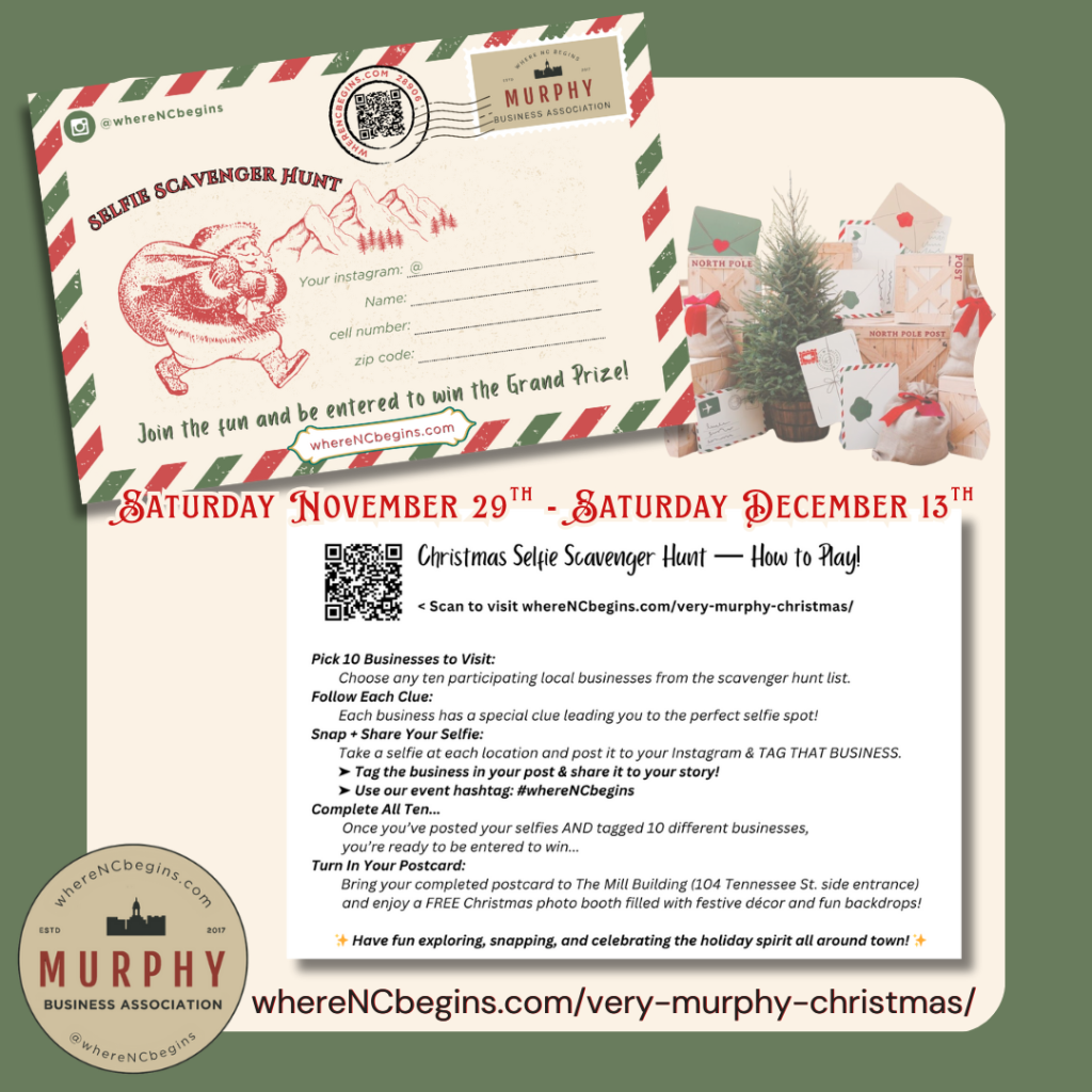 Pick up a postcard at participating Downtown Murphy businesses, Cherokee Co. Chamber of Commerce Welcome Center, or the Murphy Visitor Center!